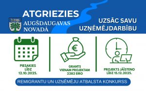 Augšdaugavas novada pašvaldība izsludina grantu konkursu uzņēmējdarbībai “Remigrācijas atbalsta pasākums – uzņēmējdarbības atbalsts” projektiem Augšdaugavas novada teritorijā. Konkursa mērķis ir motivēt remigrantus* atgriezties Augšdaugavas novadā, sekmējot uzņēmējdarbību, veidojot reģionāla mēroga produkcijas un pakalpojumu klāstu un radot jaunas darba vietas. Personas pastāvīgās dzīves ārzemēs periodam jābūt vismaz diviem gadiem. Atgriešanās vai pārcelšanās brīdim jābūt ne vairāk kā divus gadus pirms darbavietas izveidošanas vai uzņēmuma izveidošanas. Atgriešanās faktu persona pašapliecina. Lasīt vairāk >>>